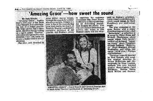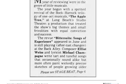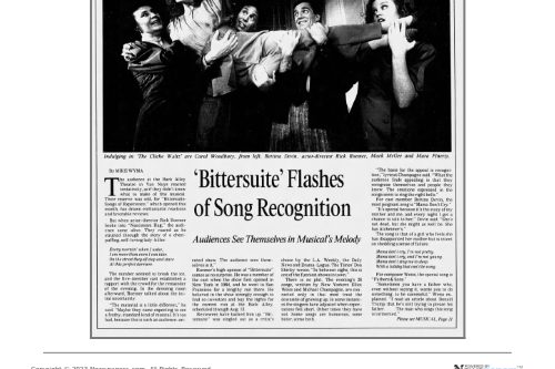 BITTERSUITE, a musical revue of 26 songs by Elliot Weiss and Michael Champagne, was meant to fill in otherwise dark days at the Back Alley (Mondays- Wednesdays) while Amazing Grace was running the rest of the week. As the LA Times said, “In the world of small theatre, where shows can have the life span of a moth, BITTERSUITE has turned into Methuselah.” While it didn’t live to 969 years, it did run nine months starting in 1988, making it the second longest-running show ever at the theatre.