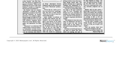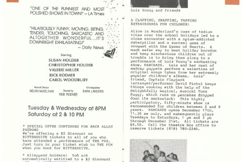 A co-production with Heartlight Productions, it was the brainchild of Rick Roemer, who had appeared in the show in 1984 in New York City at Michael’s Pub, then bought the rights and performed and co-produced it in San Francisco in 1987. At the Back Alley, Rick provided all the production elements and directed, as well as appearing in it again; the Back Alley provided the theatre, box office and marketing support.