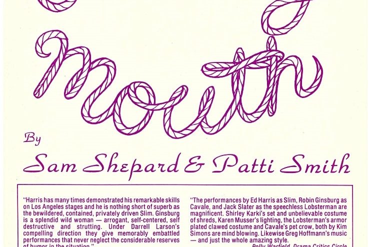 COWBOY MOUTH started a lifelong association between Ed and Sam Shepard. From an interview with Ed about Shepard in The Guardian: “Sam had just won the Pulitzer Prize for Buried Child and was already a bit of an icon when we first met. I did Cowboy Mouth, which he wrote with Patti Smith, in a little theatre in LA in 1979 and he came around to rehearsals. Then I was in his play True West, and we went for a few beers, played some pool… I think he trusted me.”