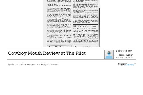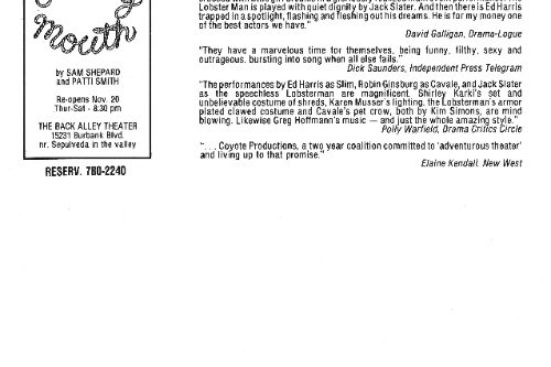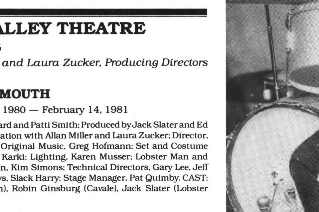 COWBOY MOUTH was written by Sam Shepard and Patti Smith, and directed by Darrell Larson. Here’s the plot according to a review in The Globe: Slim and Cavale fight in a hotel room. She cuddles a dead bird, tells stories of dead French poets and alludes to bad experiences with psychiatrists and podiatrists. He kisses her feet. At some point, Lobster Man, a giant crustacean, shows up (that was my favorite part).