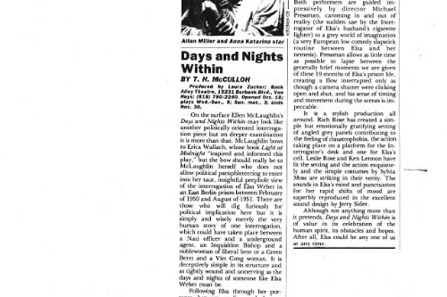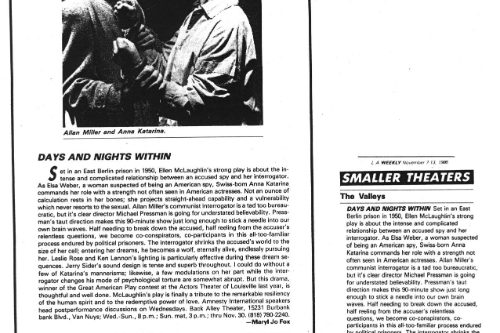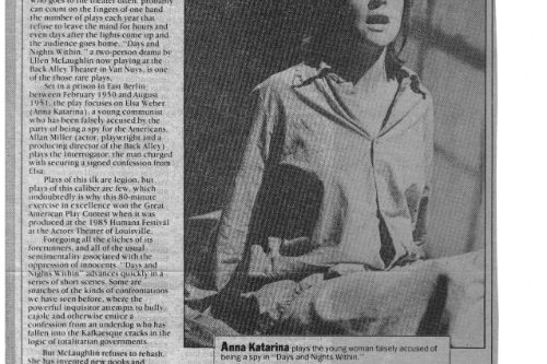 Set in a prison in East Berlin in 1950, the play is about the complex relationship between a young communist woman (Anna Katarina) falsely accused of being a spy for the Americans and her interrogator (Allan Miller), the “cold and calculating” man charged with securing a signed confession. Although the Los Angeles Times didn’t love it, everyone else did. Michael Lassell, in his Herald Examiner review, said that Anna Katarina, the Swiss actress fresh off replacing Anjelica Huston in the hit site-specific show at the American Legion in Hollywood, TAMARA, was “thrilling…her vitality and variety and mesmerizing use of her voice and body hold us rapt, as does her refusal to sign a confession come what may.” His review was rhapsodic: “The play is no longer about this woman and this man in this place and time, but about a quality of relationship, a quality of logic, a quality of power and its abuse that becomes symbolic of every such relationship in all times and places. McLaughlin’s achievement is that she has created a world of mythic density…”
