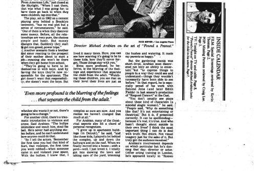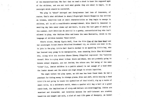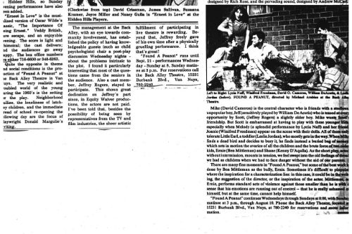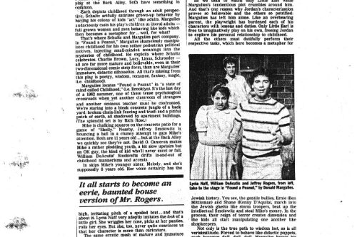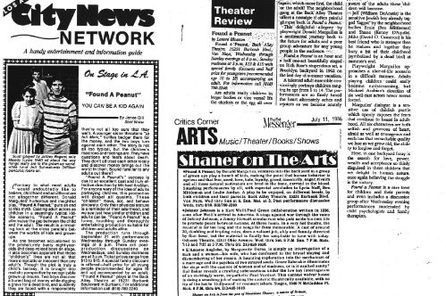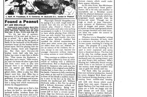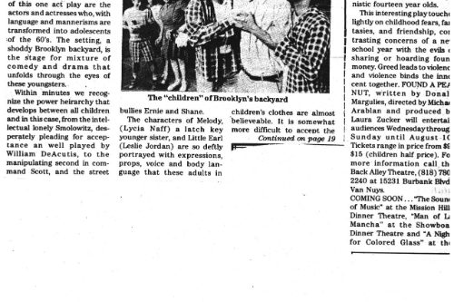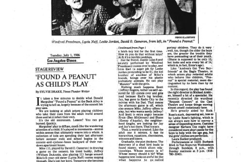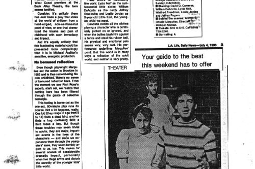 The Daily News said, “It’s unlikely there has ever been a play that looks at the world of children from a hard-edged, non-sentimental point of view, or one that dramatizes the trauma and pain of childhood with such immediacy and impact. And it’s equally unlikely that this fascinating material could be presented more compellingly than it is in Michael Arabian’s sensitive, energetic production.” The phenomenal cast embodied their parts as children with a ferocious realistic intensity. The ensemble was David O. Cameron, William DeAcutis, Winnifred Freedman, Ben Mittleman, Lycia Neff and Jeffrey Rogers, with Leslie Jordan playing the five-year-old in what was, I believe, his first role in LA.