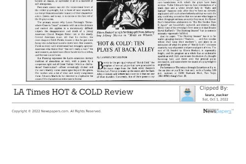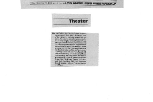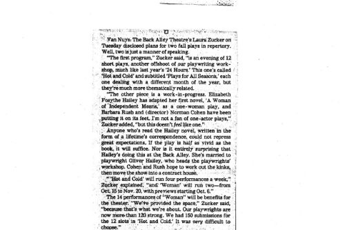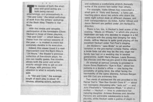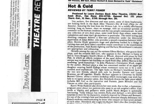 She was in LA in 1983, feeling underutilized as Nurse Decker in the ABC drama Trauma Center, with her husband and three sons back east, when Allan got a guest star role on the series. According to an interview Drama-Logue did with her, during a break one day, Allan mentioned the Back Alley’s Playwright’s Lab and its new project, HOT & COLD, twelve ten-minute plays for different months of the year. “I was interested,” she said, “because if we don’t start with the material, we have nothing to begin with.”