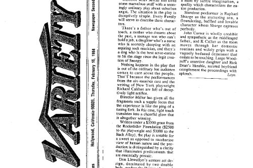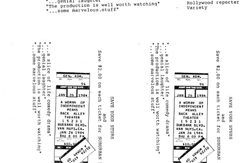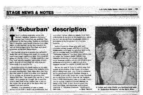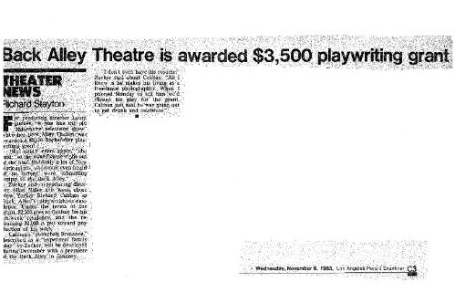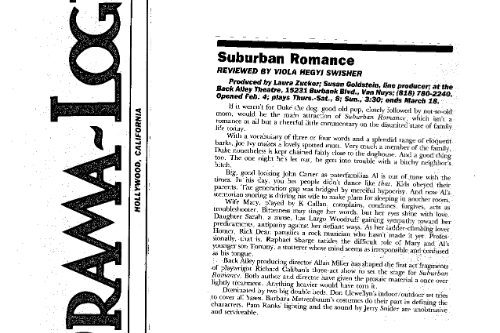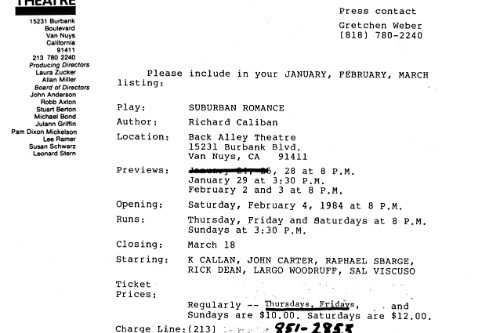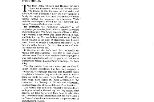 Out of the blue in 1984 we received a grant from the Rockefeller Foundation that we didn’t apply for, $2,500 for a playwright-in-residence and $1,000 toward production of their play. We put out the call for plays far and wide and selected SUBURBAN ROMANCE by Richard Caliban. Don Shirley in the LA Times said the Back Alley and the play were, “made for each other. The theatre is near the center of that archetypal suburb, the San Fernando Valley; the play examines a family that might well live there. Fortunately, Caliban neither flatters or lampoons his characters. Their real-life counterpoints should eat up SUBURBAN ROMANCE.” Most of the other reviewers thought it was just too plain ordinary, or as The Daily News said, “a scoop of vanilla ice cream melting in a dish.”