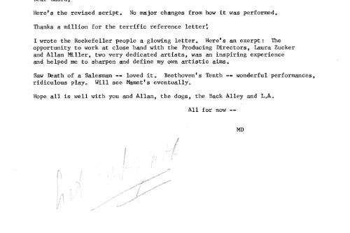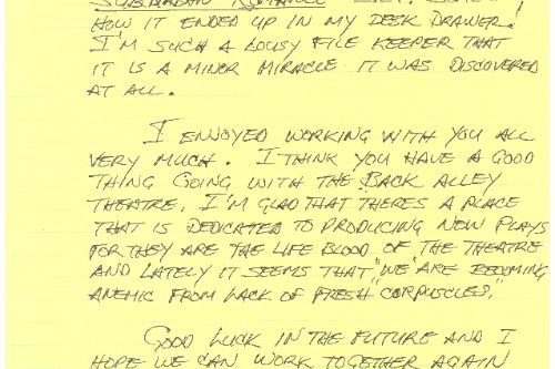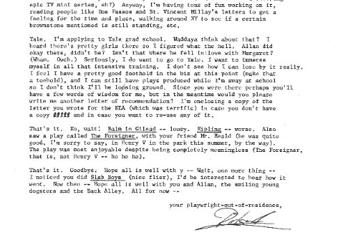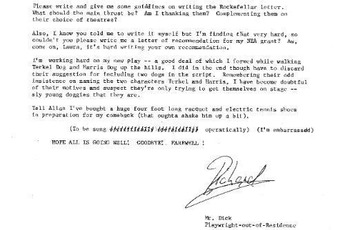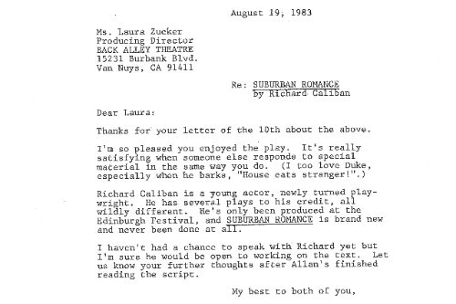 Because $2,500 doesn’t go all that far for six weeks in residence, Richard Caliban, a young New York actor turning playwright, stayed with us in our guest room. We must have worked on the play while he was here, but his letters reflect what he and we most remember: walking our dogs up into the foothills and playing tennis with Allan, who directed.