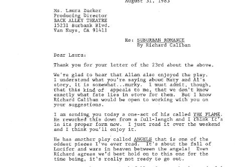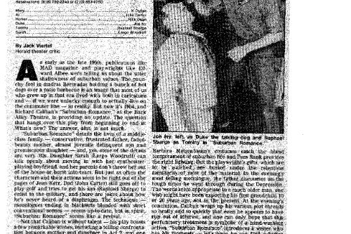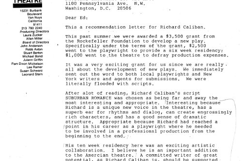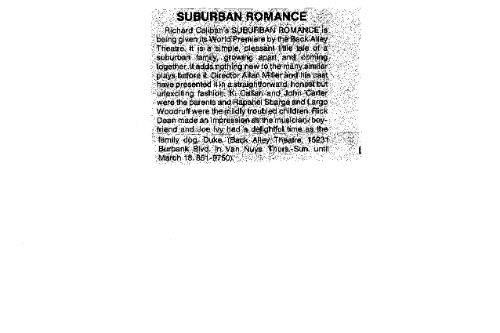 Richard Caliban became artistic director of his own theatre, and like so many of us, has found a way, one way or the other, to continue working creatively to this day. I still love SUBURBAN ROMANCE, which was never produced again, because for me it captured the wonderful and extraordinary rhythm of our daily lives with imagination and a sense of adventure. If we can’t find joy in the quotidian, we probably won’t find it anywhere. Which is what makes us keep keeping on.