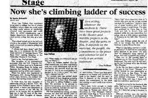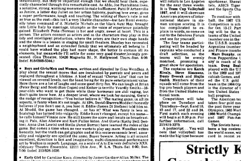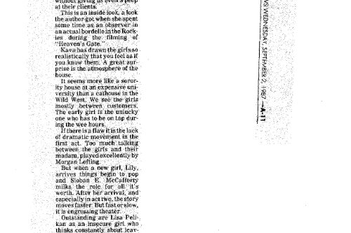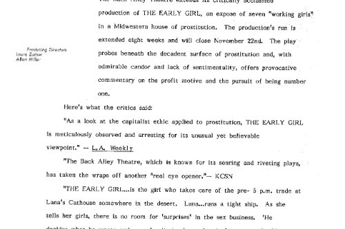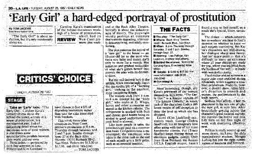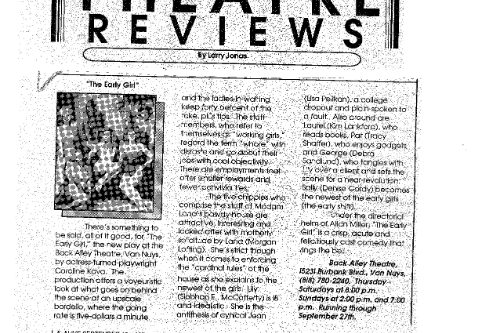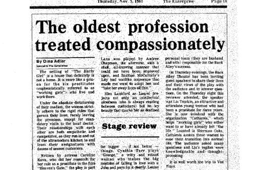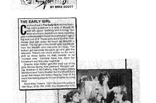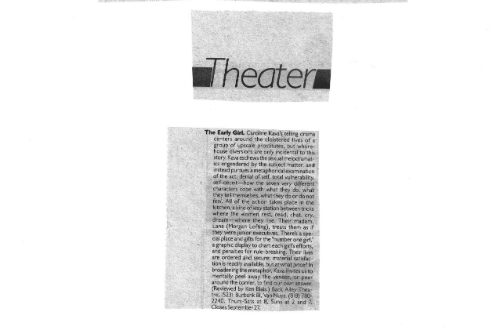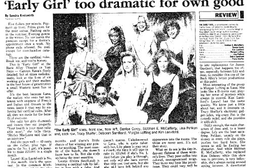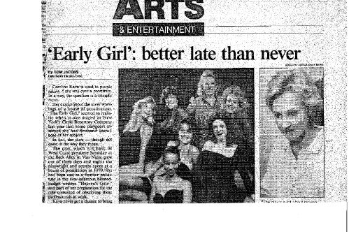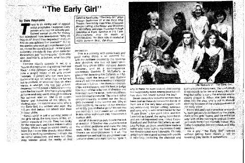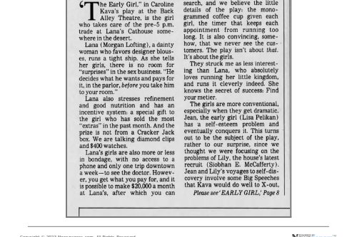 Originally produced at Circle Rep Off-Broadway in 1986, THE EARLY GIRL was actress Caroline Kava’s first play, based on her 1979 research at a house of prostitution in the Midwest while working on the film Heaven’s Gate. In NYC Demi Moore made her stage debut as Lily, the new arrival at the house, Pamela Dunlap was the madam, and Robin Bartlett stood out in otherwise mixed reviews as the early girl.