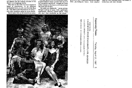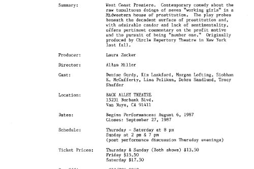 I used to suggest, only half-jokingly, that we could radically reduce the marketing budget for shows by putting “Nude Female Mud Wrestling” up on our marque and let the chips fall where they may when audiences found out it was Beckett instead. We got to test this hypothesis to some degree when we produced THE EARLY GIRL in 1987. The early girl takes care of the pre-5pm trade in a house of prostitution. It’s the booby prize that goes to the lowest earner.