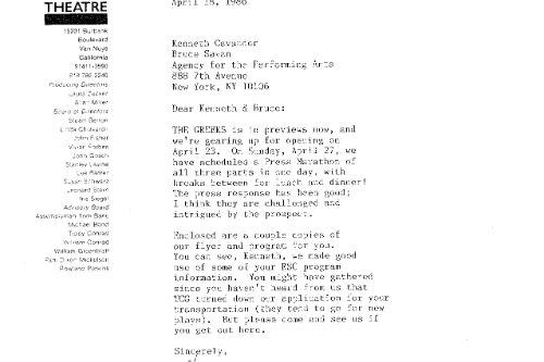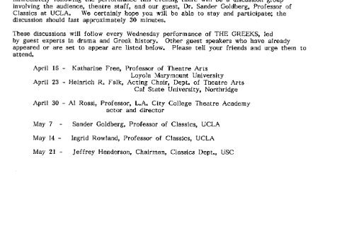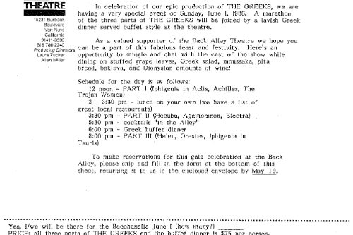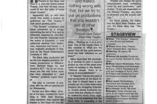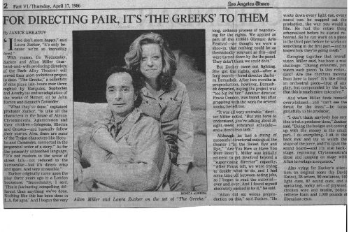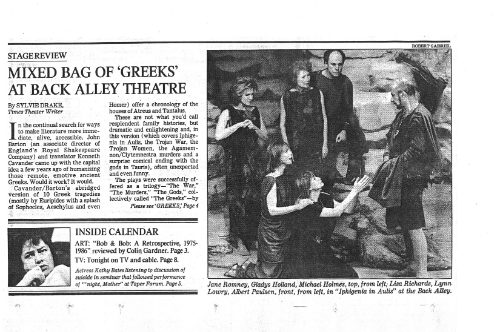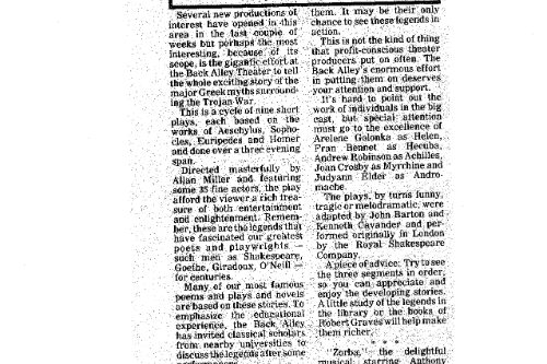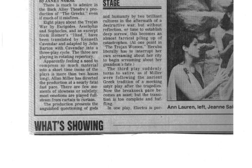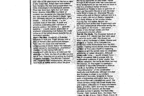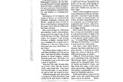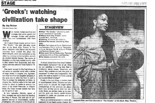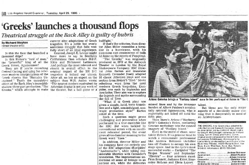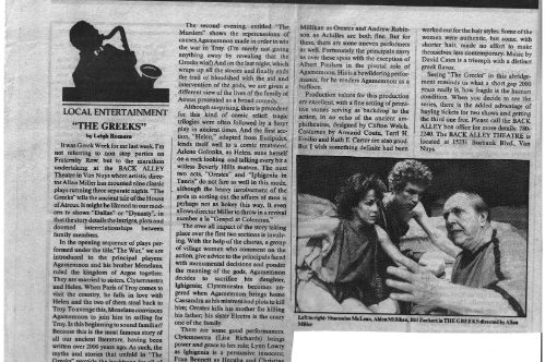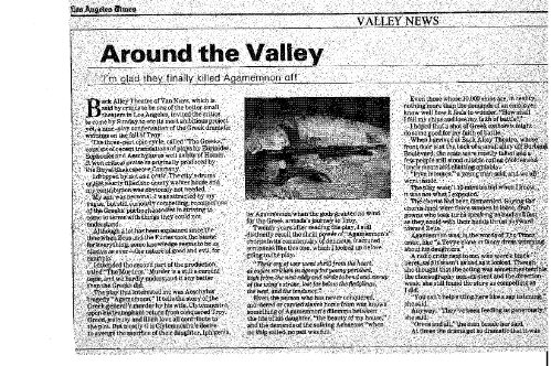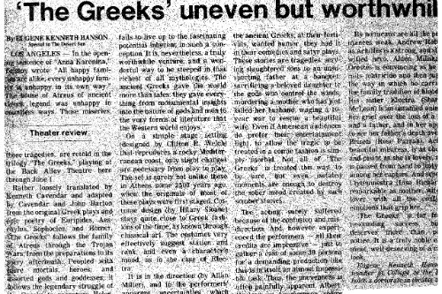 Sylvie Drake wrote in the LA Times: “It’s clear that what we have is ‘The Greeks Go to Hollywood”—a production so contemporary pedestrian, so lacking in point of view or artistic identity, that when someone asks, ’Did anyone see Ajax?’ one half expects a box of cleanser to appear.” Doug Smith, also writing in the LA Times: “I’m glad they finally killed Agamemnon off.”