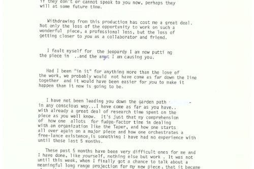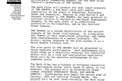 We still applied to do it as one of the local productions in the Olympic Arts Festival in 1984. The panel turned us down, as it seemed too big a project for the Back Alley to pull off. I’m quoted in an interview as saying that this was like “waving a red flag in front of my face.” I was even more determined to do it. The panel was right of course and the entire multi-year production saga was akin to sinking slowly but inextricably into quicksand. The more we struggled the deeper we sank. Hubris!