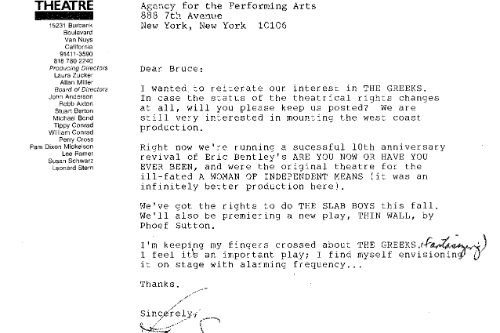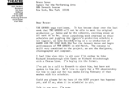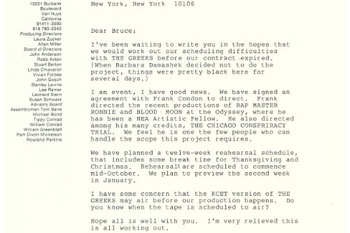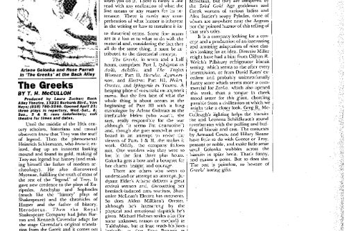 This one hurt, particularly because it was pretty much all my fault. THE GREEKS was a condensation of nine plays by Euripides, Sophocles, Aeschylus, with some Homer thrown in for good measure, that chronicles the fall of Troy and the House of Atreus. Adapted by John Barton and Kenneth Cavander into a three-part mega event it took 35 actors to perform. The Royal Shakespeare Company premiered THE GREEKS in London in 1981 and it was subsequently produced in the United States at Williamstown, Hartford Stage Co., and Seattle’s ACT. None of these productions did particularly well with the critics, but for some reason this didn’t deter me.