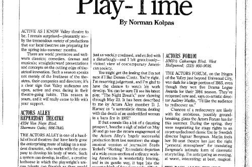 It opened finally in 1986 after two directors—Barbara Damashek (Quilters) and Frank Condon (Chicago Conspiracy Trial)– gave up along the way. Our pinch-hit director, Allan, took over. At least half the cast, including Alley Mills, Andrew Parks, Rose Portillo, Arye Gross and Kenny Mars, left at some point in the process. Allan let Barbara Bossom go and he never worked in a Steve Bocho production again.