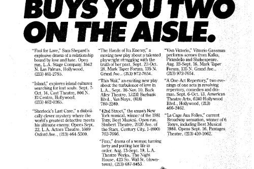 Sometimes plays came to us from afar and sometimes close to home. Dawn Bodner Sutton had come on board as the theatre’s general manager, and mostly to try to keep her budding writer husband, Phoef Sutton, employed somehow, we hired him as the stage manager and prop master for ARE YOU NOW. Phoef had a play, of course, and we thought it was good, so we produced it in 1984, splitting the week with SLAB BOYS. Ron Liebman, a frenemy of Allan’s (they often competed for the same parts), was supposed to direct it, but at some point, bailed, perhaps sensing something that we didn’t.