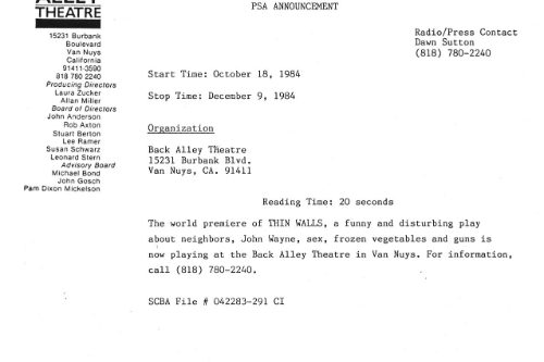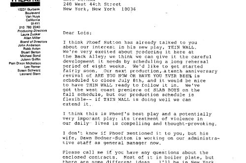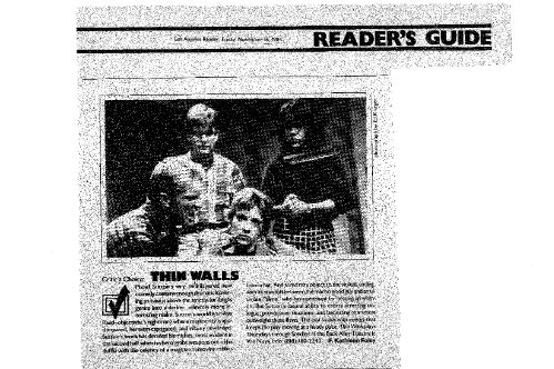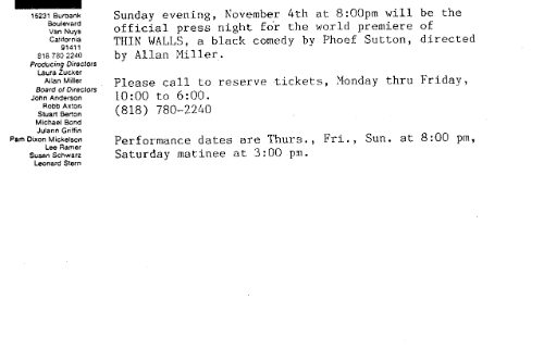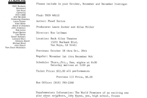 It was done again in D.C. the next year and the Washington Post thought, “Thin Walls,” Phoef Sutton’s provocative new play that opened last week at the New Playwrights’ Theatre, is a disturbing visit to the dark side of the television generation. Although the violence that runs like a virus through Sutton’s characters, infecting each in a different way, is not directly attributed to the tube, the influence is clear.”