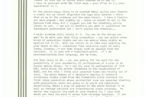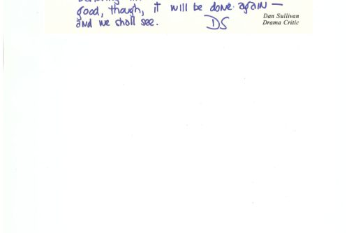 Dan wrote back: “You may be right. Sometimes a critic mistakes an innovative form for a conventional form badly handled. Alas, the latter was what THIN WALLS struck me as—cardboard characters behaving like dumbbells. If the script is good, though, it will be done again—and we shall see.”