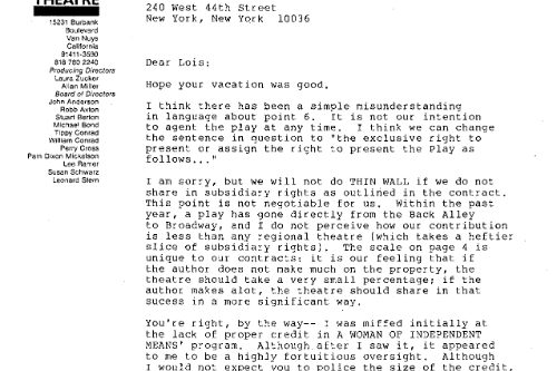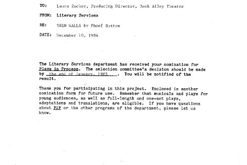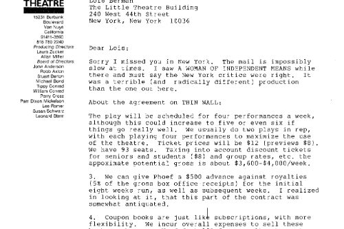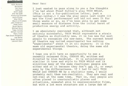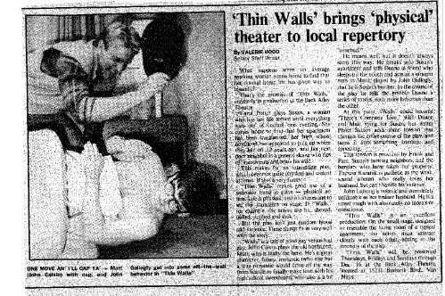 I wrote a long letter to Dan after the play closed, not a for-publication letter, “just a letter-letter” as I put it, because I was “absolutely convinced that, although not entirely successful, THIN WALLS represented a strain of theatre so distinctly new, it is too new for most people to recognize its new-ness.” I went on the say that I believed, “THIN WALLS has suffered the fate of many artistic projects that were ahead of their time. Fortunately, one can take a Jackson Pollack painting out of storage, put a Stravinsky recording onto the record player, or run a film like ‘Choose Me’ through a projector twenty years after the fact. Unfortunately, plays live almost exclusively in the moment and cannot be exhumed at a later date for easy re-viewing.”