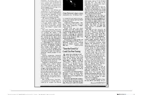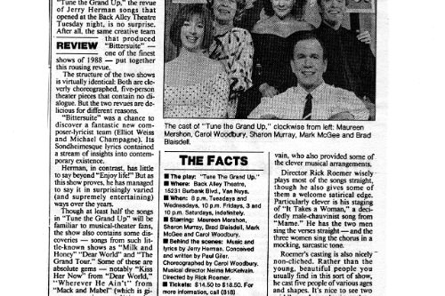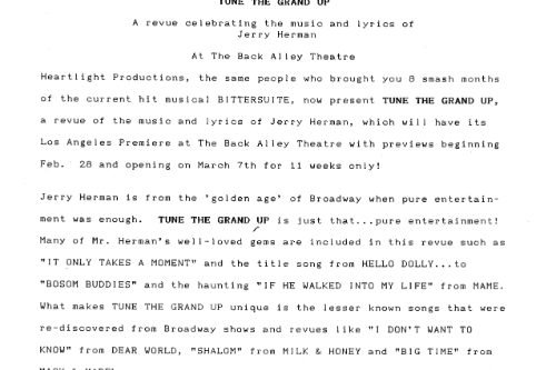 1989 we hoped to replicate the success of BITTERSUITE with a second musical review in collaboration with producer-director Rick Roemer. It was TUNE THE GRAND UP, which celebrated the words and music of Broadway composer and lyricist Jerry Herman. After its 1985 San Francisco premiere and the Back Alley’s production, the piece played in the West End in 1998 under the title The Best of Times, and Off-Broadway in 2003, titled Showtune, inspired by Herman’s autobiography of the same name.