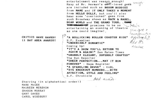 In addition to being in the revue, along with Mark McGee, Maureen Mershon, Sharon Murray, and Gary Oakes, Carol Woodbury choreographed. Musical direction was by Nelms McKelvain. The Daily News loved it, calling it “spellbinding”; the LA Times didn’t, questioning the need for another Jerry Herman review after Jerry’s Girls.