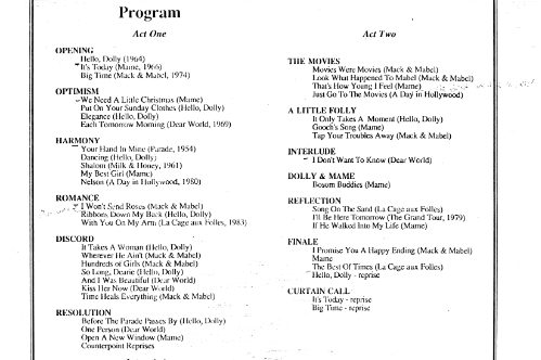 The forty songs featured came from Herman’s Broadway musicals Milk and Honey (1961), Hello, Dolly! (1964), Mame (1966), Dear World (1969), Mack & Mabel (1974), The Grand Tour (1979), A Day in Hollywood / A Night in the Ukraine (1980) and La Cage aux Folles (1983).