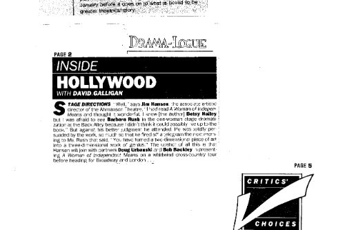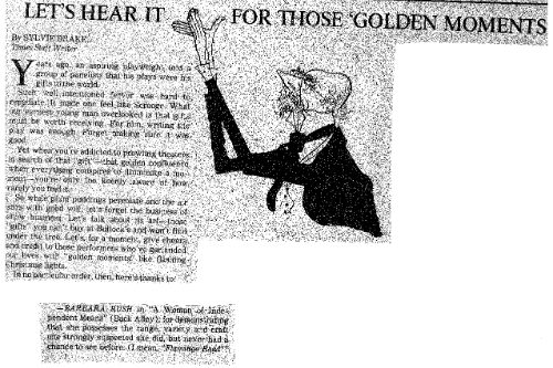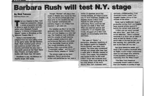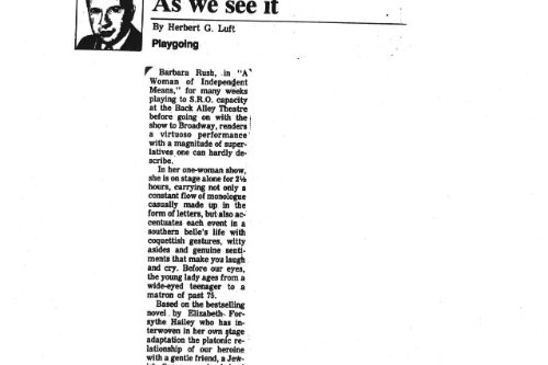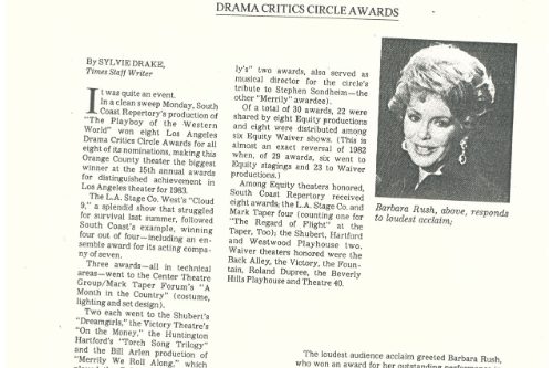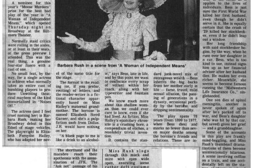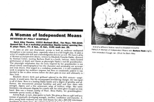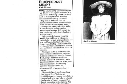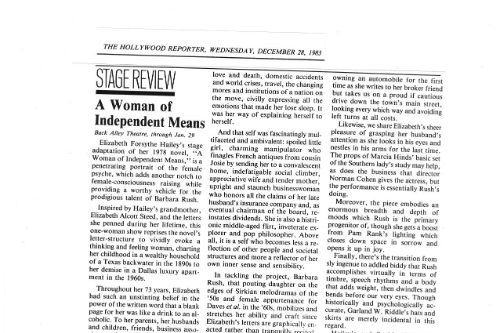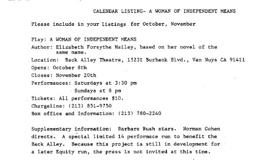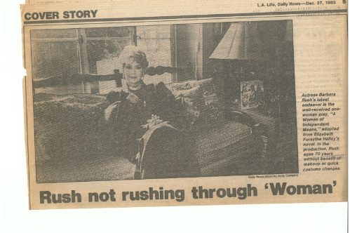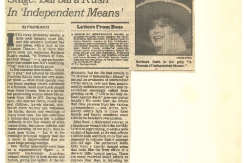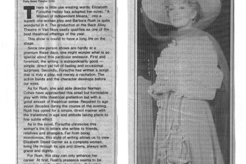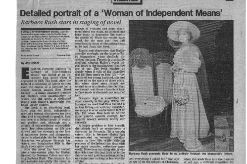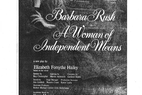 A WOMAN OF INDEPENDENT MEANS did land on Broadway the following year, but Frank Rich panned it in the NY Times, following what was by then a long trail of LA hits that crashed and burned in NY. At the LA Drama Critics Circle Awards for that year the LA Times said, “The loudest audience acclaim greeted Barbara Rush, who won an award for her outstanding performance.” In LA, Variety called her “mesmerizing…her best performance ever in a play that is cleverly written and deftly directed.” The NY critics called it “the real thing, a genuine four-star fiasco…a nominee for this year’s Moose Murders.” Go figure.