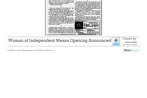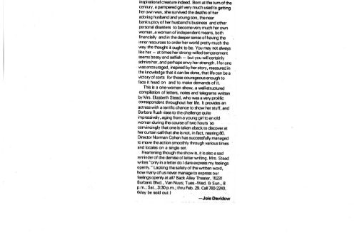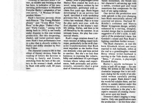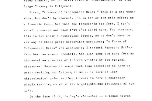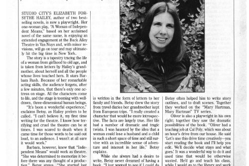 At a time when women were wrestling with what it means to be truly independent, Elizabeth Hailey’s (Betsy’s) 1978 best-selling novel, A WOMAN OF INDEPENDENT MEANS was inspired by the life of her grandmother, embodied by the fictional character Bess (Elizabeth) Steed Garner. The story, which moves from the 1900s to the 1960s, is told through her letters to the important people in her life. With Betsy’s playwright husband Oliver’s counsel, she decided to try to turn her novel into a one-hander, and fortuitously took it to their friend, Barbara Rush, who jumped at the property as a perfect vehicle for herself.