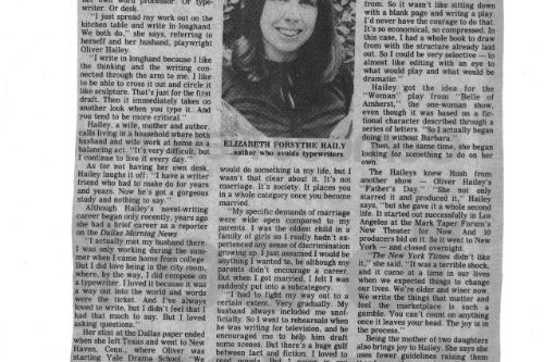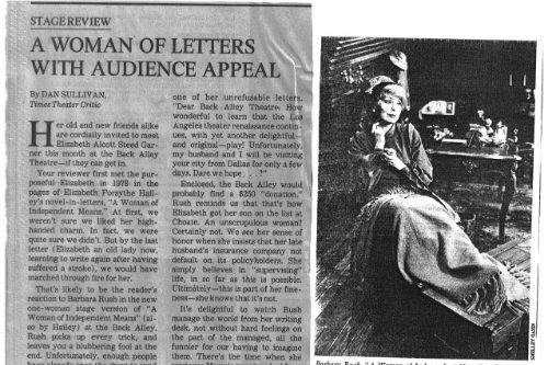 “Elizabeth, of course, would manage it. She would sit down at her graceful writing desk and compose one of her unrefusable letters. ‘Dear Back Alley Theatre: How wonderful to learn that the Los Angeles theatre renaissance continues, with yet another delightful and original—play! Unfortunately, my husband and I will be visiting your city from Dallas for only a few days. Dare we hope…?’ Enclosed, the Back Alley would probably find a $250 ‘donation.’”