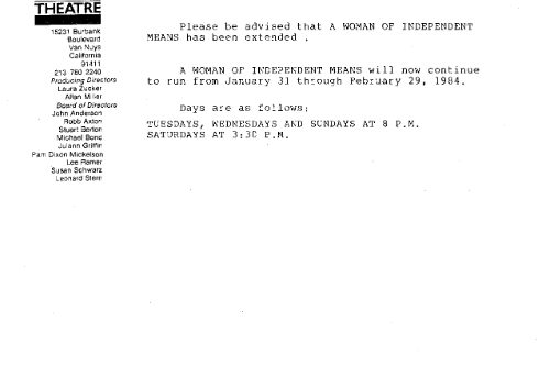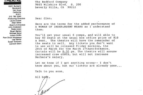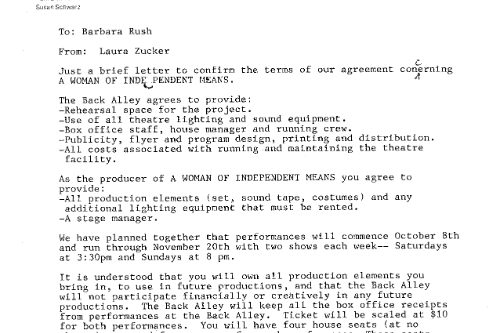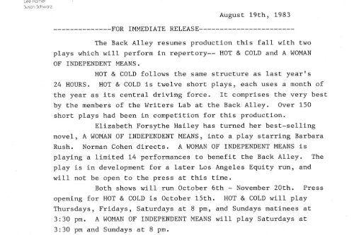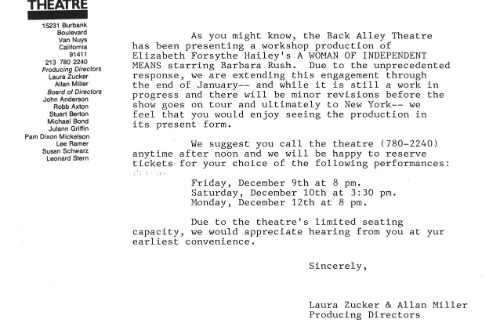 In 1983 when they were ready to workshop the play, they brought it to us and we entered a co-production agreement with Barbara. The Back Alley provided the theatre, running crew and marketing, and Barbara pulled together all the production elements. We kept the ticket sales but waived financial participation or credit in future productions. Norman Cohen directed, with costume designer Garland Riddle and sound designer Jon Gottlieb.